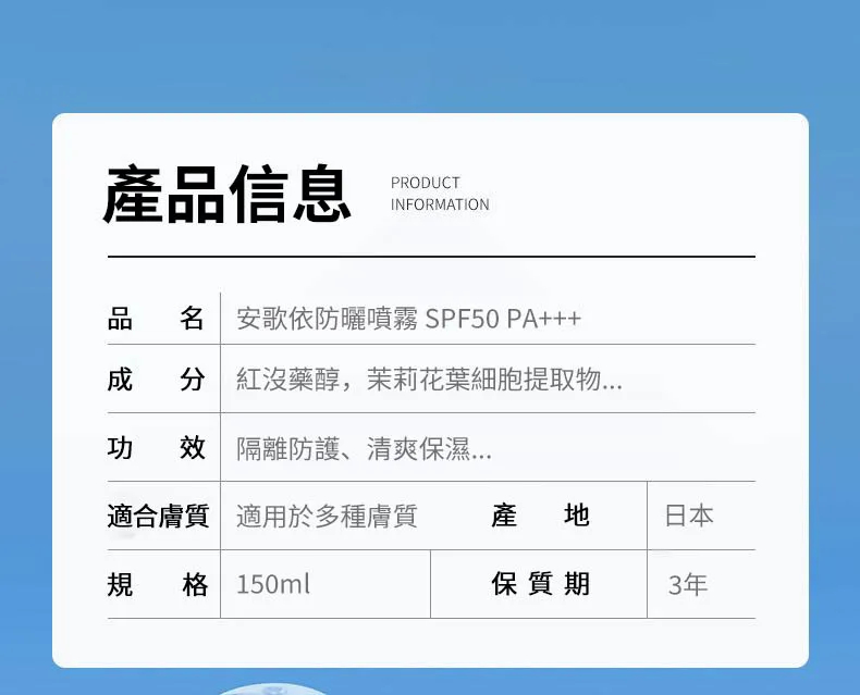 20分鐘前安歌依光圈防曬噴霧,細密噴頭設計 噴頭360°可旋轉自然膚惑,隔離防曬一瓶搞定 - 僅此一天「安歌依光圈防曬噴霧」8入72%用戶的選擇!NT$1598【限時免運】